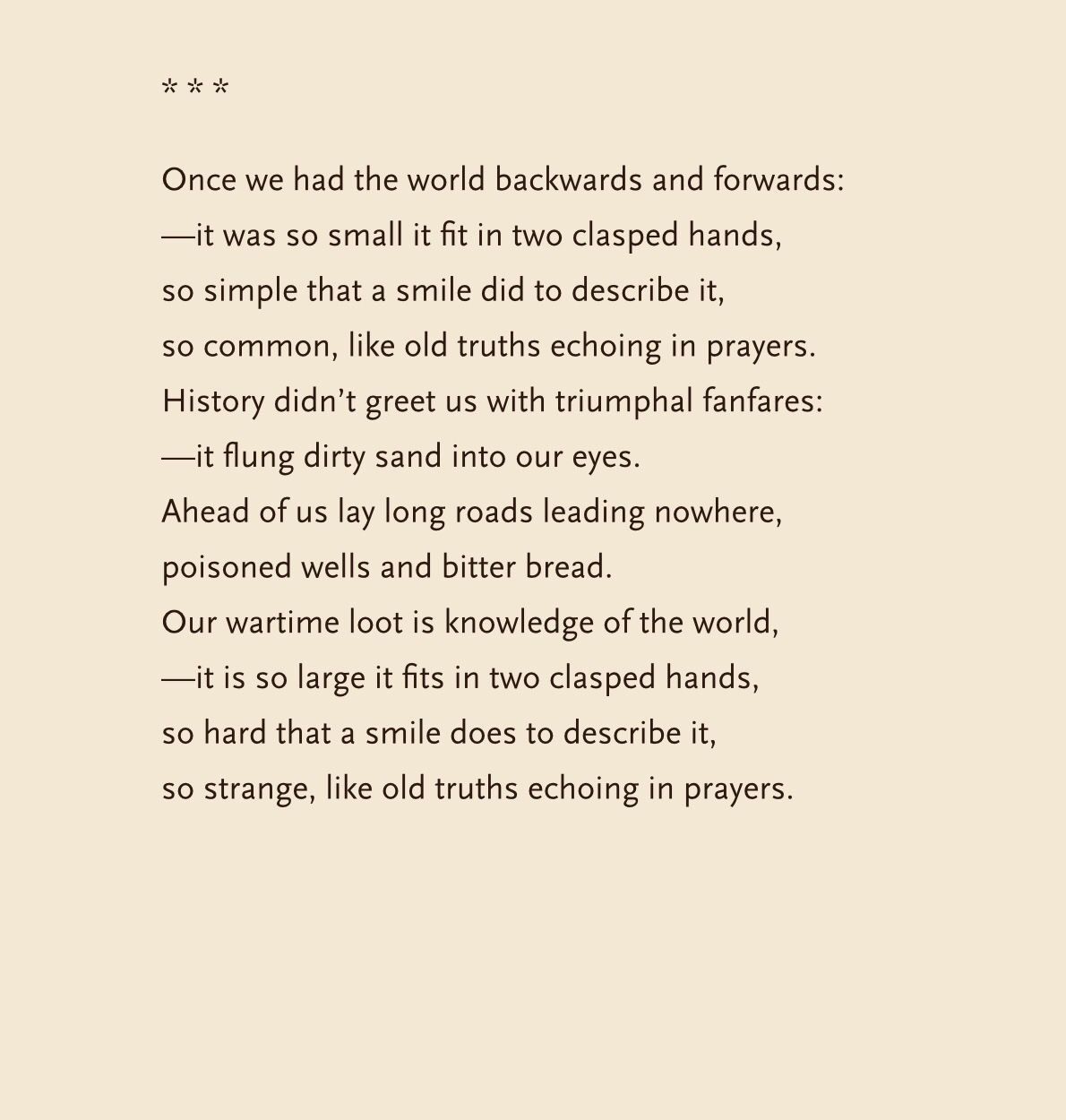 We live in a state of siege. If one takes a close look at each fragment of a moment, one might choke with terror. Within our bodies disintegration inexorably advances; soon we shall fall sick and die. Our loved ones will leave us, the memories of them will dissolve in the tumult; nothing will remain. Just a few clothes in the wardrobe and someone in a photograph, no longer recognized.
